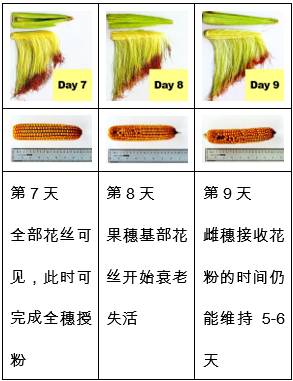 花絲在伸出苞葉后的7天內,都能夠接收花粉。大田環境下,一般吐絲后的1-2天內就能授粉,授粉后的24小時內就完成受精。