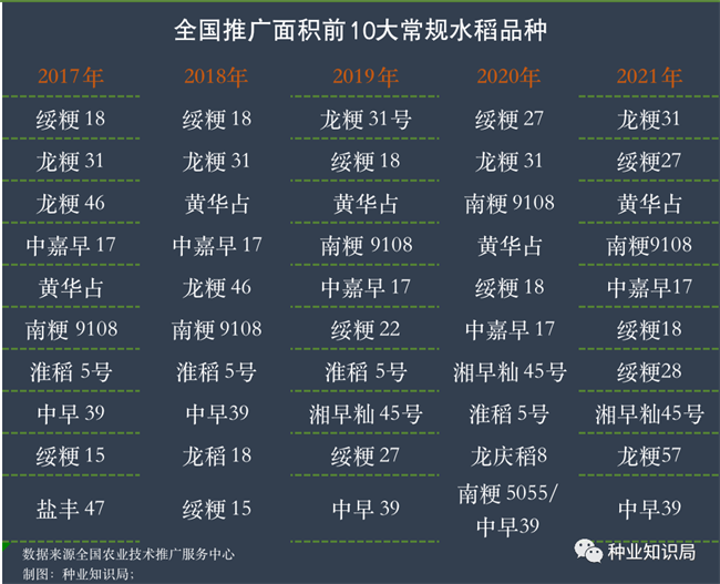??????可以看到,常規稻品種排名變化不大,龍粳31、綏粳27、黃華占、南粳9108、中嘉早17、綏粳18連年位于推廣面積前幾位,成為“常勝將軍”。