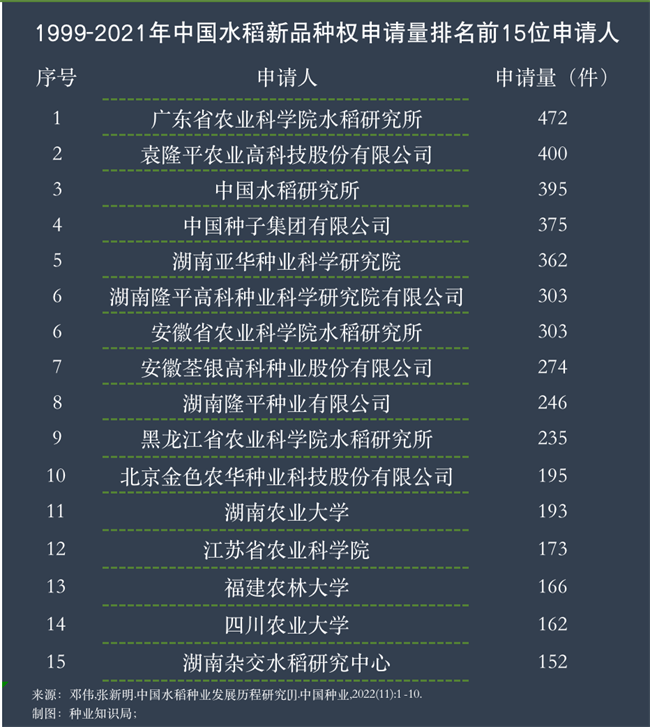 ??????從水稻品種權申請情況來看,1999—2021年,申請量排名前15名的申請人共申請了4406件,占水稻總申請量的34.32%,其中排名前3位的分別是廣東省農業科學院水稻研究所,申請了472件;袁隆平農業高科技股份有限公司,申請了400件;中國水稻研究所,申請了395件。