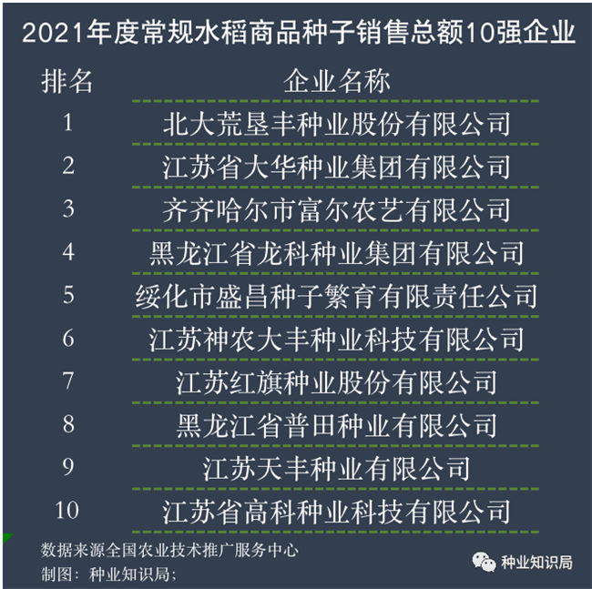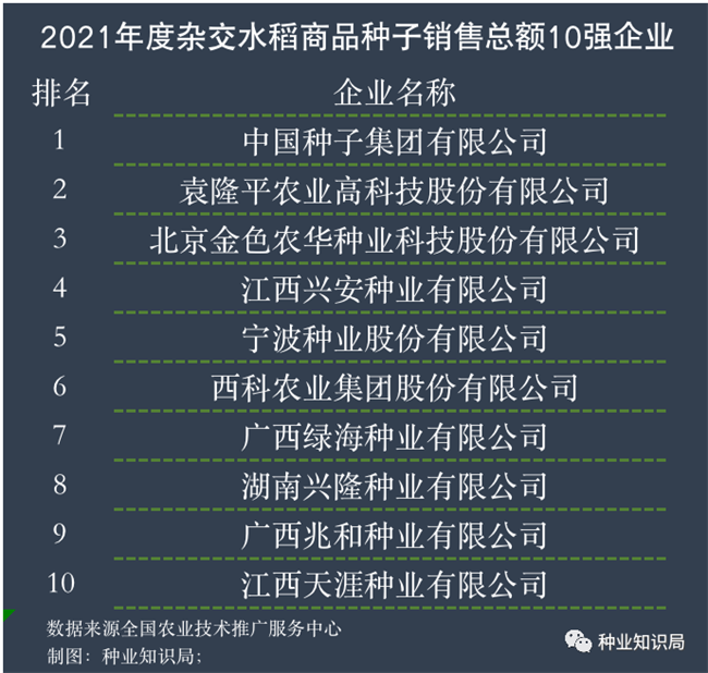??????哪些企業的品種叫座?從種子銷售額來看,根據全國農技中心數據,2021年,常規水稻商品種子銷售額前3位分別是北大荒墾豐種業股份有限公司、江蘇省大華種業集團有限公司、齊齊哈爾市富爾農藝有限公司;2021年,雜交水稻商品種子銷售額前3位分別是中國種子集團有限公司、袁隆平農業高科技股份有限公司、北京金色農華種業科技股份有限公司。