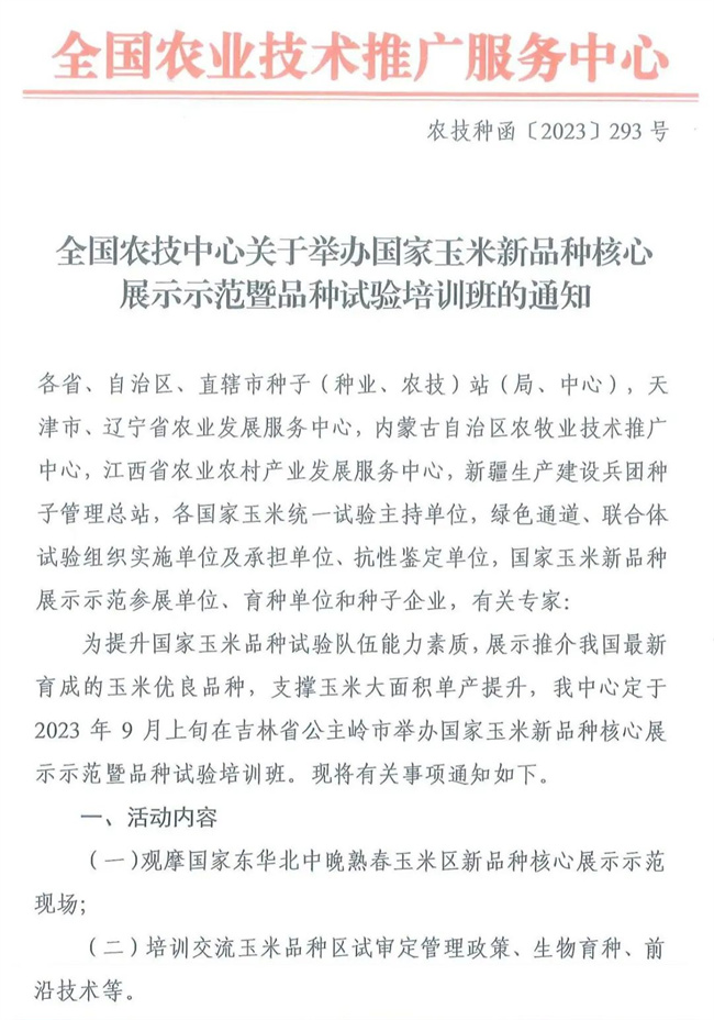 為提升國家玉米品種試驗隊伍能力素質,展示推介我國最新育成的玉米優良品種,支撐玉米大面積單產提升,我中心定于2023年9月上旬在吉林省公主嶺市舉辦國家玉米新品種核心展示示范暨品種試驗培訓班。現將有關事項通知如下。