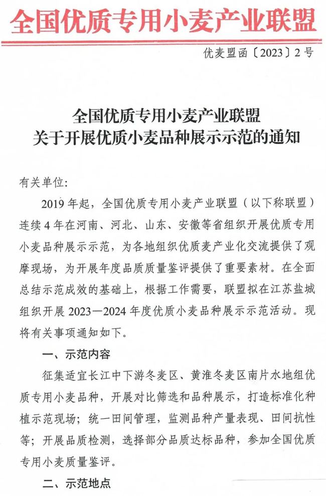 全國優質專用小麥產業聯盟關于開展優質小麥品種展示示范的通知