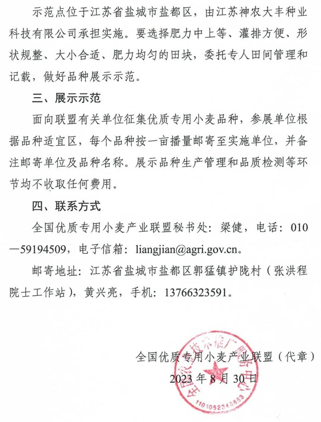 2019年起,全國優質專用小麥產(chan)業(ye)聯盟(以下稱(cheng)聯盟)連續(xu)4年(nian)在(zai)河南、河北、山東、安徽等(deng)省(sheng)組(zu)織開展(zhan)優質(zhi)專用(yong)小麥(mai)品種展(zhan)示示范,為各地(di)組(zu)織優質(zhi)麥(mai)產(chan)業(ye)化交流提供了觀摩現(xian)場,為開展(zhan)年(nian)度品質(zhi)質(zhi)量鑒(jian)評提供了重要素材。在(zai)全面總結示范成效的基礎上,根據工作(zuo)需要,聯盟擬(ni)在(zai)江蘇鹽城(cheng)組(zu)織開展(zhan)2023—2024年(nian)度優質(zhi)小麥(mai)品種展(zhan)示示范活動。現(xian)將有關事項通知(zhi)如下。