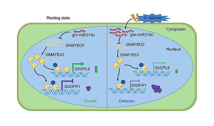 當前,提高棉花產量仍然是棉花品種選育的第一目標,良好的株型結構和高抗病性是保證棉花高產和穩產的關鍵。該研究鑒定到了一個調控棉花生長與抗性平衡的關鍵基因GhMYB33,發現該基因突變體顯著提高了對黃萎病菌的抗性。進一步研究發現,該基因的轉錄水平受到微小RNA的精細調控,從而作為一個樞紐,動態調控棉花的株高和抗病性。該研究闡明了以GhMYB33為樞紐蛋白平衡棉花生長發育與防御響應的調控通路,為創制兼顧生長發育和抗性的優異棉花材料提供了基因資源。