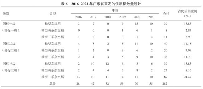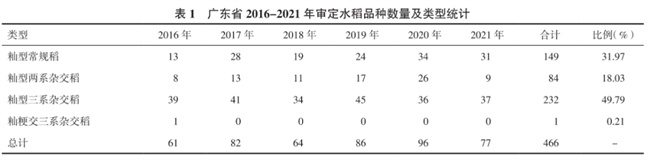 從表1可(ke)知(zhi),廣東(dong)省2016-2021年(nian)(nian)審(shen)(shen)(shen)定(ding)(ding)通(tong)(tong)過的(de)水(shui)稻(dao)(dao)品(pin)(pin)種共466個(ge)(ge)(ge)(ge),其中2016年(nian)(nian)61個(ge)(ge)(ge)(ge)、2017年(nian)(nian)82個(ge)(ge)(ge)(ge)、2018年(nian)(nian)64個(ge)(ge)(ge)(ge)、2019年(nian)(nian)86個(ge)(ge)(ge)(ge)、2020年(nian)(nian)96個(ge)(ge)(ge)(ge)、2021年(nian)(nian)77個(ge)(ge)(ge)(ge),年(nian)(nian)平均(jun)審(shen)(shen)(shen)定(ding)(ding)78個(ge)(ge)(ge)(ge)品(pin)(pin)種;廣東(dong)省審(shen)(shen)(shen)定(ding)(ding)通(tong)(tong)過的(de)水(shui)稻(dao)(dao)品(pin)(pin)種類型(xing)(xing)主要是(shi)秈型(xing)(xing)常規(gui)(gui)稻(dao)(dao)、秈型(xing)(xing)兩(liang)系(xi)雜交稻(dao)(dao)和(he)秈型(xing)(xing)三系(xi)雜交稻(dao)(dao),其品(pin)(pin)種數量分別為149個(ge)(ge)(ge)(ge)、84個(ge)(ge)(ge)(ge)、232個(ge)(ge)(ge)(ge),分別占總數的(de)31.97%、18.03%和(he)49.79%,均(jun)適宜在廣東(dong)省內早晚造種植。有(you)(you)21個(ge)(ge)(ge)(ge)香稻(dao)(dao)通(tong)(tong)過審(shen)(shen)(shen)定(ding)(ding),包含秈型(xing)(xing)常規(gui)(gui)稻(dao)(dao)11個(ge)(ge)(ge)(ge)和(he)秈型(xing)(xing)三系(xi)雜交稻(dao)(dao)10個(ge)(ge)(ge)(ge);有(you)(you)18個(ge)(ge)(ge)(ge)有(you)(you)色稻(dao)(dao)通(tong)(tong)過審(shen)(shen)(shen)定(ding)(ding),其中紅米(mi)17個(ge)(ge)(ge)(ge)(包含9個(ge)(ge)(ge)(ge)秈型(xing)(xing)常規(gui)(gui)稻(dao)(dao)、6個(ge)(ge)(ge)(ge)秈型(xing)(xing)兩(liang)系(xi)雜交稻(dao)(dao)、2個(ge)(ge)(ge)(ge)秈型(xing)(xing)三系(xi)雜交稻(dao)(dao))、黑(hei)米(mi)1個(ge)(ge)(ge)(ge)(南兩(liang)優黑(hei)一號)。