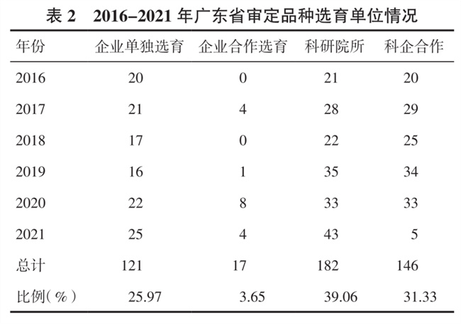 廣(guang)東(dong)省2016-2021年通過審(shen)定(ding)的466個水稻品(pin)種(zhong)主要由科(ke)研院(yuan)所、企(qi)(qi)業以及科(ke)企(qi)(qi)合(he)作選育(yu)(yu),企(qi)(qi)業合(he)作選育(yu)(yu)的品(pin)種(zhong)數(shu)量(liang)較少,其中(zhong)由科(ke)研院(yuan)所選育(yu)(yu)的品(pin)種(zhong)數(shu)量(liang)為182個,占(zhan)39.06%;由企(qi)(qi)業單獨(du)選育(yu)(yu)的品(pin)種(zhong)數(shu)量(liang)為121個,占(zhan)25.97%;由科(ke)研院(yuan)所和企(qi)(qi)業合(he)作選育(yu)(yu)的品(pin)種(zhong)數(shu)量(liang)為146個,占(zhan)31.33%;由企(qi)(qi)業間合(he)作選育(yu)(yu)的品(pin)種(zhong)數(shu)量(liang)為17個,僅占(zhan)3.65%(表2)。