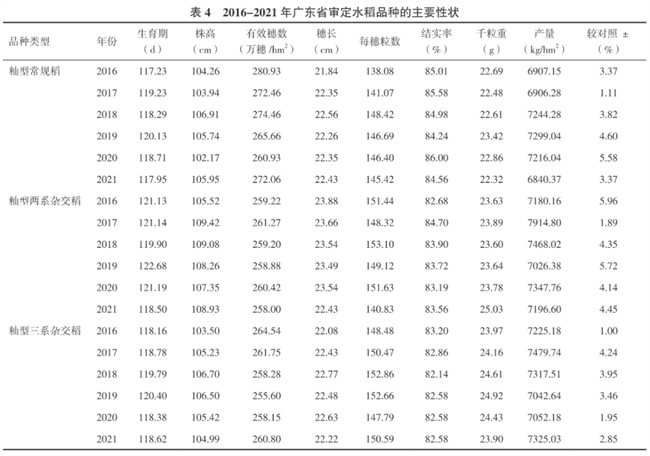2016-2021年廣東省審定(ding)的水稻(dao)品(pin)種中(zhong),各類型(xing)(xing)(xing)(xing)水稻(dao)品(pin)種生(sheng)(sheng)育期、株高、有效穗數、穗長、結(jie)實(shi)率、千(qian)粒(li)重和(he)生(sheng)(sheng)產試驗產量均(jun)(jun)比較接近(表4)。秈(xian)(xian)(xian)型(xing)(xing)(xing)(xing)常(chang)(chang)規(gui)稻(dao)和(he)秈(xian)(xian)(xian)型(xing)(xing)(xing)(xing)雜交(jiao)(jiao)(jiao)(jiao)稻(dao)的平(ping)(ping)均(jun)(jun)生(sheng)(sheng)育期在(zai)(zai)(zai)(zai)117.23~122.68d之(zhi)間(jian)(jian)(jian),平(ping)(ping)均(jun)(jun)株高在(zai)(zai)(zai)(zai)102.17~109.42cm之(zhi)間(jian)(jian)(jian),平(ping)(ping)均(jun)(jun)有效穗數在(zai)(zai)(zai)(zai)255.60~280.93萬穗/hm²之(zhi)間(jian)(jian)(jian),平(ping)(ping)均(jun)(jun)穗長在(zai)(zai)(zai)(zai)21.84~23.88cm之(zhi)間(jian)(jian)(jian),平(ping)(ping)均(jun)(jun)每穗粒(li)數在(zai)(zai)(zai)(zai)138.08~153.10粒(li)之(zhi)間(jian)(jian)(jian);秈(xian)(xian)(xian)型(xing)(xing)(xing)(xing)常(chang)(chang)規(gui)稻(dao)的結(jie)實(shi)率在(zai)(zai)(zai)(zai)84.24%~86.00%之(zhi)間(jian)(jian)(jian),高于(yu)秈(xian)(xian)(xian)型(xing)(xing)(xing)(xing)兩(liang)系(xi)(xi)雜交(jiao)(jiao)(jiao)(jiao)稻(dao)(82.68%~84.70%)和(he)秈(xian)(xian)(xian)型(xing)(xing)(xing)(xing)三(san)系(xi)(xi)雜交(jiao)(jiao)(jiao)(jiao)稻(dao)(82.14%~83.20%)的結(jie)實(shi)率;秈(xian)(xian)(xian)型(xing)(xing)(xing)(xing)三(san)系(xi)(xi)雜交(jiao)(jiao)(jiao)(jiao)稻(dao)和(he)秈(xian)(xian)(xian)型(xing)(xing)(xing)(xing)兩(liang)系(xi)(xi)雜交(jiao)(jiao)(jiao)(jiao)稻(dao)的千(qian)粒(li)重分(fen)(fen)別在(zai)(zai)(zai)(zai)23.90~24.92g、23.60~25.03g之(zhi)間(jian)(jian)(jian),略高于(yu)秈(xian)(xian)(xian)型(xing)(xing)(xing)(xing)常(chang)(chang)規(gui)稻(dao)的千(qian)粒(li)重(22.32~23.42g);秈(xian)(xian)(xian)型(xing)(xing)(xing)(xing)兩(liang)系(xi)(xi)雜交(jiao)(jiao)(jiao)(jiao)稻(dao)以及秈(xian)(xian)(xian)型(xing)(xing)(xing)(xing)三(san)系(xi)(xi)雜交(jiao)(jiao)(jiao)(jiao)稻(dao)的產量分(fen)(fen)別在(zai)(zai)(zai)(zai)7026.38~7914.80kg/hm²、7042.64~7479.74kg/hm²之(zhi)間(jian)(jian)(jian),略高于(yu)秈(xian)(xian)(xian)型(xing)(xing)(xing)(xing)常(chang)(chang)規(gui)稻(dao)的產量(6840.37~7299.04kg/hm²);相(xiang)對于(yu)對照品(pin)種,秈(xian)(xian)(xian)型(xing)(xing)(xing)(xing)常(chang)(chang)規(gui)稻(dao)、秈(xian)(xian)(xian)型(xing)(xing)(xing)(xing)兩(liang)系(xi)(xi)雜交(jiao)(jiao)(jiao)(jiao)稻(dao)、秈(xian)(xian)(xian)型(xing)(xing)(xing)(xing)三(san)系(xi)(xi)雜交(jiao)(jiao)(jiao)(jiao)稻(dao)分(fen)(fen)別增產1.11%~5.58%、1.89%~5.96%、1.00%~4.24%。