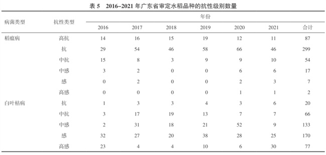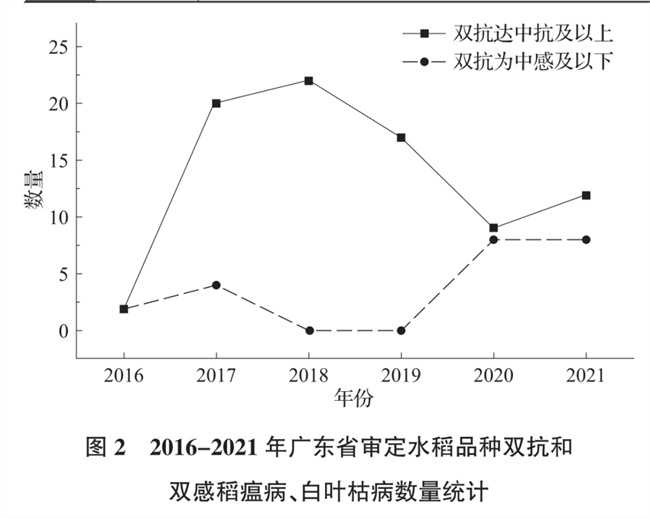 由表5可知,2016-2021年(nian)廣(guang)東(dong)省(sheng)(sheng)審(shen)(shen)定(ding)通(tong)過的(de)(de)(de)水(shui)(shui)稻(dao)(dao)(dao)(dao)品(pin)(pin)種稻(dao)(dao)(dao)(dao)瘟(wen)(wen)病(bing)抗(kang)(kang)性(xing)(xing)為(wei)高抗(kang)(kang)、抗(kang)(kang)、中(zhong)抗(kang)(kang)、中(zhong)感(gan)、感(gan)和(he)(he)高感(gan)的(de)(de)(de)水(shui)(shui)稻(dao)(dao)(dao)(dao)品(pin)(pin)種數(shu)量分(fen)別為(wei)87個(ge)(ge)(ge)(ge)、299個(ge)(ge)(ge)(ge)、54個(ge)(ge)(ge)(ge)、17個(ge)(ge)(ge)(ge)、7個(ge)(ge)(ge)(ge)和(he)(he)2個(ge)(ge)(ge)(ge),稻(dao)(dao)(dao)(dao)瘟(wen)(wen)病(bing)抗(kang)(kang)性(xing)(xing)中(zhong)抗(kang)(kang)及(ji)以(yi)上(shang)的(de)(de)(de)水(shui)(shui)稻(dao)(dao)(dao)(dao)品(pin)(pin)種數(shu)量為(wei)440個(ge)(ge)(ge)(ge),占94.42%,表明(ming)(ming)廣(guang)東(dong)省(sheng)(sheng)2016-2021年(nian)所(suo)審(shen)(shen)定(ding)通(tong)過的(de)(de)(de)水(shui)(shui)稻(dao)(dao)(dao)(dao)品(pin)(pin)種具備較強(qiang)的(de)(de)(de)稻(dao)(dao)(dao)(dao)瘟(wen)(wen)病(bing)抗(kang)(kang)性(xing)(xing)。2016-2021年(nian)廣(guang)東(dong)省(sheng)(sheng)通(tong)過審(shen)(shen)定(ding)的(de)(de)(de)水(shui)(shui)稻(dao)(dao)(dao)(dao)品(pin)(pin)種白(bai)葉(xie)(xie)(xie)枯(ku)病(bing)抗(kang)(kang)性(xing)(xing)為(wei)抗(kang)(kang)、中(zhong)抗(kang)(kang)、中(zhong)感(gan)、感(gan)和(he)(he)高感(gan)的(de)(de)(de)水(shui)(shui)稻(dao)(dao)(dao)(dao)品(pin)(pin)種數(shu)量分(fen)別為(wei)20個(ge)(ge)(ge)(ge)、66個(ge)(ge)(ge)(ge)、133個(ge)(ge)(ge)(ge)、170個(ge)(ge)(ge)(ge)和(he)(he)77個(ge)(ge)(ge)(ge),白(bai)葉(xie)(xie)(xie)枯(ku)病(bing)抗(kang)(kang)性(xing)(xing)中(zhong)抗(kang)(kang)及(ji)以(yi)上(shang)的(de)(de)(de)水(shui)(shui)稻(dao)(dao)(dao)(dao)品(pin)(pin)種數(shu)量為(wei)86個(ge)(ge)(ge)(ge),占18.45%,說明(ming)(ming)廣(guang)東(dong)省(sheng)(sheng)2016-2021年(nian)所(suo)審(shen)(shen)定(ding)通(tong)過的(de)(de)(de)水(shui)(shui)稻(dao)(dao)(dao)(dao)品(pin)(pin)種的(de)(de)(de)白(bai)葉(xie)(xie)(xie)枯(ku)病(bing)抗(kang)(kang)性(xing)(xing)仍有提升的(de)(de)(de)空間;同時(shi)具備雙(shuang)抗(kang)(kang)(稻(dao)(dao)(dao)(dao)瘟(wen)(wen)病(bing)、白(bai)葉(xie)(xie)(xie)枯(ku)病(bing)抗(kang)(kang)性(xing)(xing))達(da)中(zhong)抗(kang)(kang)及(ji)以(yi)上(shang)水(shui)(shui)平的(de)(de)(de)水(shui)(shui)稻(dao)(dao)(dao)(dao)品(pin)(pin)種數(shu)量為(wei)82個(ge)(ge)(ge)(ge)(圖2)。