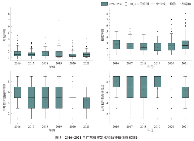 廣東省2016-2021年(nian)各年(nian)審(shen)定(ding)通過的(de)水稻品(pin)(pin)(pin)種(zhong)葉(xie)瘟和穗(sui)瘟等(deng)(deng)(deng)級(ji)(ji)(ji)(ji)較低且波動(dong)幅度較小(圖(tu)3),其審(shen)定(ding)品(pin)(pin)(pin)種(zhong)的(de)葉(xie)瘟等(deng)(deng)(deng)級(ji)(ji)(ji)(ji)范(fan)圍(wei)在(zai)0.8~3.0之(zhi)(zhi)間(jian),50%的(de)品(pin)(pin)(pin)種(zhong)葉(xie)瘟等(deng)(deng)(deng)級(ji)(ji)(ji)(ji)在(zai)1.2~2.0之(zhi)(zhi)間(jian),葉(xie)瘟平均(jun)等(deng)(deng)(deng)級(ji)(ji)(ji)(ji)、中位(wei)(wei)(wei)數(shu)(shu)(shu)等(deng)(deng)(deng)級(ji)(ji)(ji)(ji)分(fen)別(bie)(bie)在(zai)1.45~1.76、1.4~1.6之(zhi)(zhi)間(jian);審(shen)定(ding)品(pin)(pin)(pin)種(zhong)的(de)穗(sui)瘟等(deng)(deng)(deng)級(ji)(ji)(ji)(ji)范(fan)圍(wei)在(zai)1.0~5.4之(zhi)(zhi)間(jian),50%的(de)品(pin)(pin)(pin)種(zhong)數(shu)(shu)(shu)量穗(sui)瘟等(deng)(deng)(deng)級(ji)(ji)(ji)(ji)在(zai)1.7~3.5之(zhi)(zhi)間(jian),穗(sui)瘟平均(jun)等(deng)(deng)(deng)級(ji)(ji)(ji)(ji)、中位(wei)(wei)(wei)數(shu)(shu)(shu)等(deng)(deng)(deng)級(ji)(ji)(ji)(ji)分(fen)別(bie)(bie)在(zai)2.27~2.81、2.2~3.0之(zhi)(zhi)間(jian)。白葉(xie)枯(ku)菌株(zhu)(zhu)的(de)抗性(xing)有一定(ding)的(de)波動(dong),2016年(nian)審(shen)定(ding)水稻品(pin)(pin)(pin)種(zhong)的(de)白葉(xie)枯(ku)菌株(zhu)(zhu)抗性(xing)弱于其他年(nian)份(fen),2016年(nian)Ⅳ型菌株(zhu)(zhu)抗性(xing)的(de)平均(jun)等(deng)(deng)(deng)級(ji)(ji)(ji)(ji)、中位(wei)(wei)(wei)數(shu)(shu)(shu)等(deng)(deng)(deng)級(ji)(ji)(ji)(ji)分(fen)別(bie)(bie)為6.79、7.0,Ⅴ型菌株(zhu)(zhu)抗性(xing)的(de)平均(jun)等(deng)(deng)(deng)級(ji)(ji)(ji)(ji)、中位(wei)(wei)(wei)數(shu)(shu)(shu)等(deng)(deng)(deng)級(ji)(ji)(ji)(ji)分(fen)別(bie)(bie)為8.07、7.0,而(er)2017-2021年(nian)份(fen)的(de)Ⅳ型菌株(zhu)(zhu)抗性(xing)平均(jun)等(deng)(deng)(deng)級(ji)(ji)(ji)(ji)、中位(wei)(wei)(wei)數(shu)(shu)(shu)等(deng)(deng)(deng)級(ji)(ji)(ji)(ji)分(fen)別(bie)(bie)為4.42~5.21、5.0,Ⅴ型菌株(zhu)(zhu)抗性(xing)平均(jun)等(deng)(deng)(deng)級(ji)(ji)(ji)(ji)、中位(wei)(wei)(wei)數(shu)(shu)(shu)等(deng)(deng)(deng)級(ji)(ji)(ji)(ji)分(fen)別(bie)(bie)為6.30~7.07、7.0(圖(tu)3)。