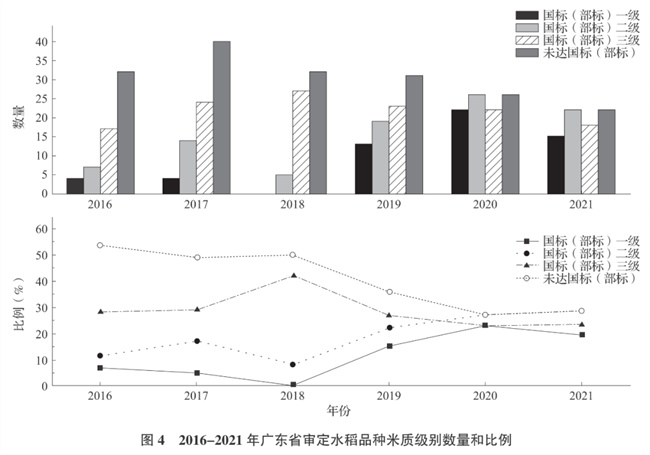 廣(guang)(guang)東省2016-2021年(nian)審定(ding)(ding)的(de)(de)(de)(de)(de)水稻(dao)(dao)(dao)品(pin)種(zhong)中(zhong)有(you)282個(ge)水稻(dao)(dao)(dao)品(pin)種(zhong)米質(zhi)達(da)到(dao)(dao)國標(biao)優(you)(you)質(zhi)三(san)級(ji)(部(bu)標(biao)三(san)級(ji))及以上,其(qi)中(zhong)秈(xian)型常(chang)規稻(dao)(dao)(dao)118個(ge)、秈(xian)型三(san)系雜(za)(za)交(jiao)稻(dao)(dao)(dao)113個(ge)、秈(xian)型兩系雜(za)(za)交(jiao)稻(dao)(dao)(dao)51個(ge),共占審定(ding)(ding)品(pin)種(zhong)總數(shu)的(de)(de)(de)(de)(de)60.52%(表6)。廣(guang)(guang)東省審定(ding)(ding)通過的(de)(de)(de)(de)(de)水稻(dao)(dao)(dao)品(pin)種(zhong)達(da)到(dao)(dao)國標(biao)一(yi)級(ji)(部(bu)標(biao)一(yi)級(ji))和(he)國標(biao)二級(ji)(部(bu)標(biao)二級(ji))的(de)(de)(de)(de)(de)優(you)(you)質(zhi)水稻(dao)(dao)(dao)品(pin)種(zhong)比例(li)整(zheng)體(ti)增(zeng)(zeng)加(jia),未達(da)國標(biao)(部(bu)標(biao))米質(zhi)優(you)(you)質(zhi)的(de)(de)(de)(de)(de)品(pin)種(zhong)數(shu)量比例(li)由2016-2018年(nian)的(de)(de)(de)(de)(de)48.78%~54.10%逐(zhu)漸下降至2020年(nian)的(de)(de)(de)(de)(de)27.08%和(he)2021年(nian)的(de)(de)(de)(de)(de)28.57%,達(da)到(dao)(dao)國標(biao)(部(bu)標(biao))優(you)(you)質(zhi)的(de)(de)(de)(de)(de)水稻(dao)(dao)(dao)品(pin)種(zhong)數(shu)量占比整(zheng)體(ti)增(zeng)(zeng)加(jia)(圖4)。2016-2021年(nian)廣(guang)(guang)東省審定(ding)(ding)的(de)(de)(de)(de)(de)水稻(dao)(dao)(dao)品(pin)種(zhong)的(de)(de)(de)(de)(de)堊白度逐(zhu)年(nian)下降,稻(dao)(dao)(dao)米透明度級(ji)別逐(zhu)年(nian)降低,稻(dao)(dao)(dao)米的(de)(de)(de)(de)(de)長寬(kuan)比在2020-2021年(nian)有(you)增(zeng)(zeng)加(jia)的(de)(de)(de)(de)(de)趨勢,所審定(ding)(ding)品(pin)種(zhong)的(de)(de)(de)(de)(de)整(zheng)體(ti)米質(zhi)性(xing)狀有(you)一(yi)定(ding)(ding)的(de)(de)(de)(de)(de)提升(表7)。