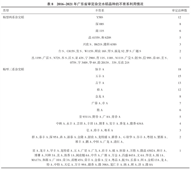 由表8可知,2016-2021年廣(guang)東省(sheng)審(shen)(shen)(shen)(shen)定(ding)通(tong)過(guo)的(de)317個(ge)(ge)(ge)(ge)(ge)雜(za)交(jiao)(jiao)稻(dao)(dao)(dao)品(pin)種(zhong)(zhong)共(gong)(gong)使用了(le)129個(ge)(ge)(ge)(ge)(ge)不(bu)(bu)育系(xi)(xi)(xi)(xi)(xi),其中兩系(xi)(xi)(xi)(xi)(xi)不(bu)(bu)育系(xi)(xi)(xi)(xi)(xi)38個(ge)(ge)(ge)(ge)(ge)、三系(xi)(xi)(xi)(xi)(xi)不(bu)(bu)育系(xi)(xi)(xi)(xi)(xi)91個(ge)(ge)(ge)(ge)(ge)。所審(shen)(shen)(shen)(shen)定(ding)的(de)317個(ge)(ge)(ge)(ge)(ge)雜(za)交(jiao)(jiao)稻(dao)(dao)(dao)中,有(you)180個(ge)(ge)(ge)(ge)(ge)雜(za)交(jiao)(jiao)稻(dao)(dao)(dao)利用了(le)本省(sheng)選(xuan)育的(de)52個(ge)(ge)(ge)(ge)(ge)不(bu)(bu)育系(xi)(xi)(xi)(xi)(xi),137個(ge)(ge)(ge)(ge)(ge)雜(za)交(jiao)(jiao)稻(dao)(dao)(dao)利用了(le)外(wai)省(sheng)選(xuan)育的(de)77個(ge)(ge)(ge)(ge)(ge)不(bu)(bu)育系(xi)(xi)(xi)(xi)(xi),表明(ming)廣(guang)東省(sheng)審(shen)(shen)(shen)(shen)定(ding)雜(za)交(jiao)(jiao)稻(dao)(dao)(dao)利用的(de)不(bu)(bu)育系(xi)(xi)(xi)(xi)(xi)來源較廣(guang),對外(wai)省(sheng)的(de)不(bu)(bu)育系(xi)(xi)(xi)(xi)(xi)依賴程度不(bu)(bu)高(gao);總共(gong)(gong)有(you)71個(ge)(ge)(ge)(ge)(ge)不(bu)(bu)育系(xi)(xi)(xi)(xi)(xi)僅有(you)1個(ge)(ge)(ge)(ge)(ge)品(pin)種(zhong)(zhong)通(tong)過(guo)審(shen)(shen)(shen)(shen)定(ding),27個(ge)(ge)(ge)(ge)(ge)不(bu)(bu)育系(xi)(xi)(xi)(xi)(xi)有(you)2個(ge)(ge)(ge)(ge)(ge)品(pin)種(zhong)(zhong)通(tong)過(guo)品(pin)種(zhong)(zhong)審(shen)(shen)(shen)(shen)定(ding),分別(bie)占不(bu)(bu)育系(xi)(xi)(xi)(xi)(xi)總數的(de)55.04%和(he)20.93%。恒豐(feng)(feng)A所配組合(he)中通(tong)過(guo)審(shen)(shen)(shen)(shen)定(ding)的(de)水(shui)稻(dao)(dao)(dao)品(pin)種(zhong)(zhong)最多(共(gong)(gong)18個(ge)(ge)(ge)(ge)(ge)),其次是(shi)五(wu)豐(feng)(feng)A(15個(ge)(ge)(ge)(ge)(ge))、吉豐(feng)(feng)A(13個(ge)(ge)(ge)(ge)(ge))、Y58S和(he)裕A(12個(ge)(ge)(ge)(ge)(ge))、深08S和(he)金龍A(8個(ge)(ge)(ge)(ge)(ge))、廣(guang)泰(tai)A和(he)卓A(7個(ge)(ge)(ge)(ge)(ge))、南11S和(he)勝(sheng)A(6個(ge)(ge)(ge)(ge)(ge)),表明(ming)這(zhe)些不(bu)(bu)育系(xi)(xi)(xi)(xi)(xi)具備較高(gao)的(de)配合(he)力。(參考(kao)文獻略)