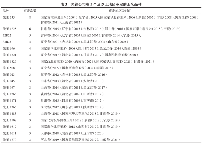 先鋒公司在3個及以上地區審定的品種分析