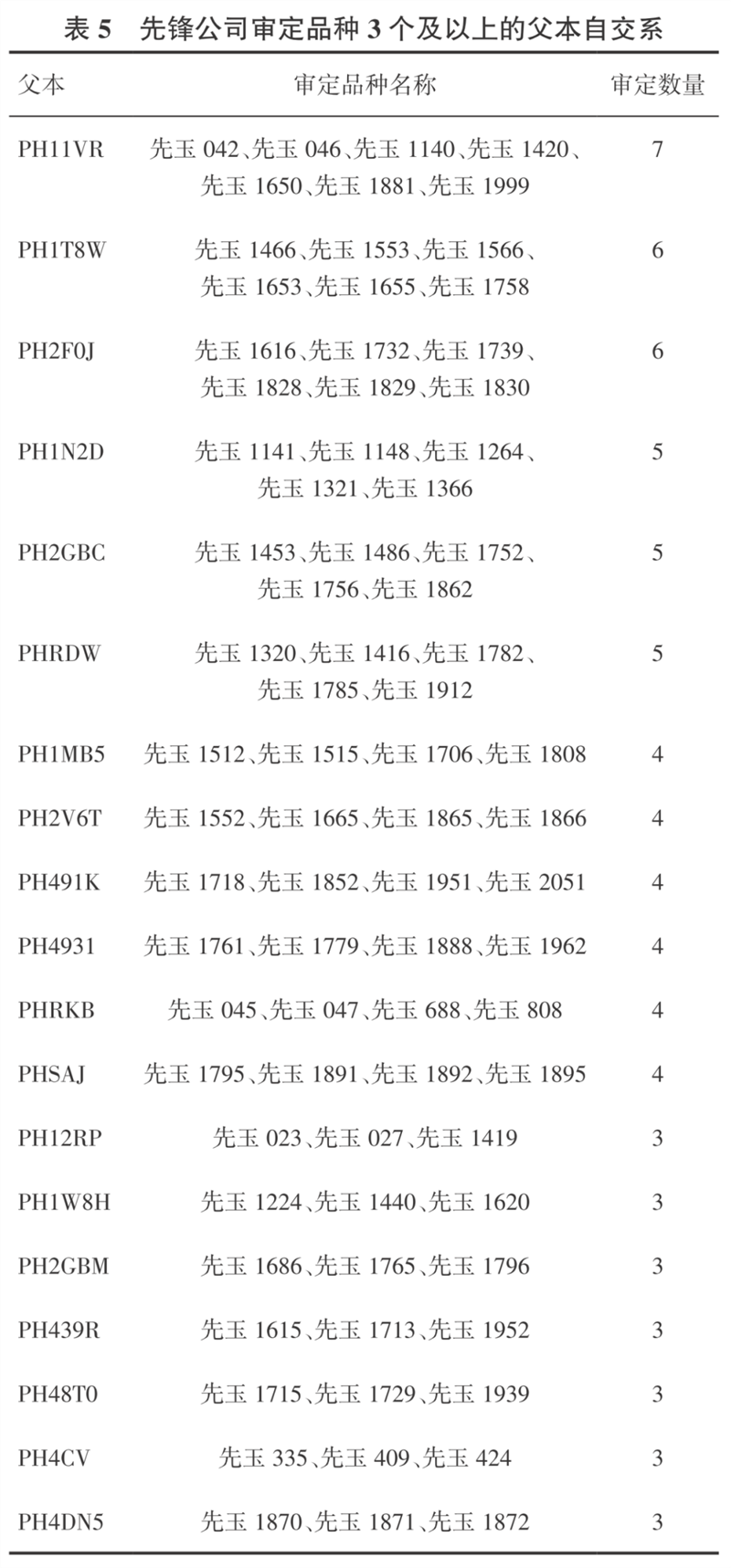 2001-2022年期間先鋒公司在我國審定185個品種的親本自交系中19個自交系作為父本合計審定了79個品種,從表5可知,每個自交系審定品種都在3個及以上,自交系PH11VR作為父本先后審定了7個品種,PH1T8W和PH2F0J作為父本審定了6個品種,PH1N2D、PH2GBC、PHRDW這3個自交系作為父本各審定了5個品種,PH1MB5、PH2V6T、PH491K、PH4931、PHRKB、PHSAJ這6個自交系作為父本各審定了4個品種,PH12RP、PH1W8H、PH2GBM、PH439R、PH48T0、PH4CV、PH4DN5這7個自交系分別審定3個品種。