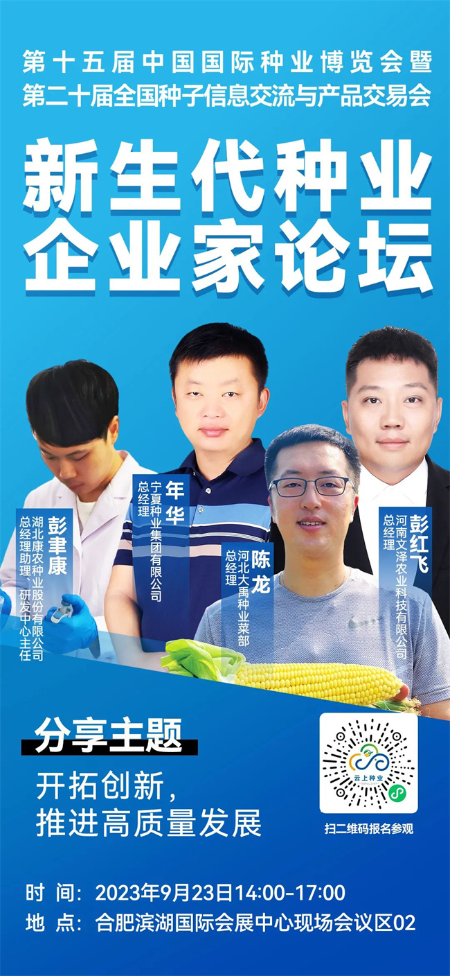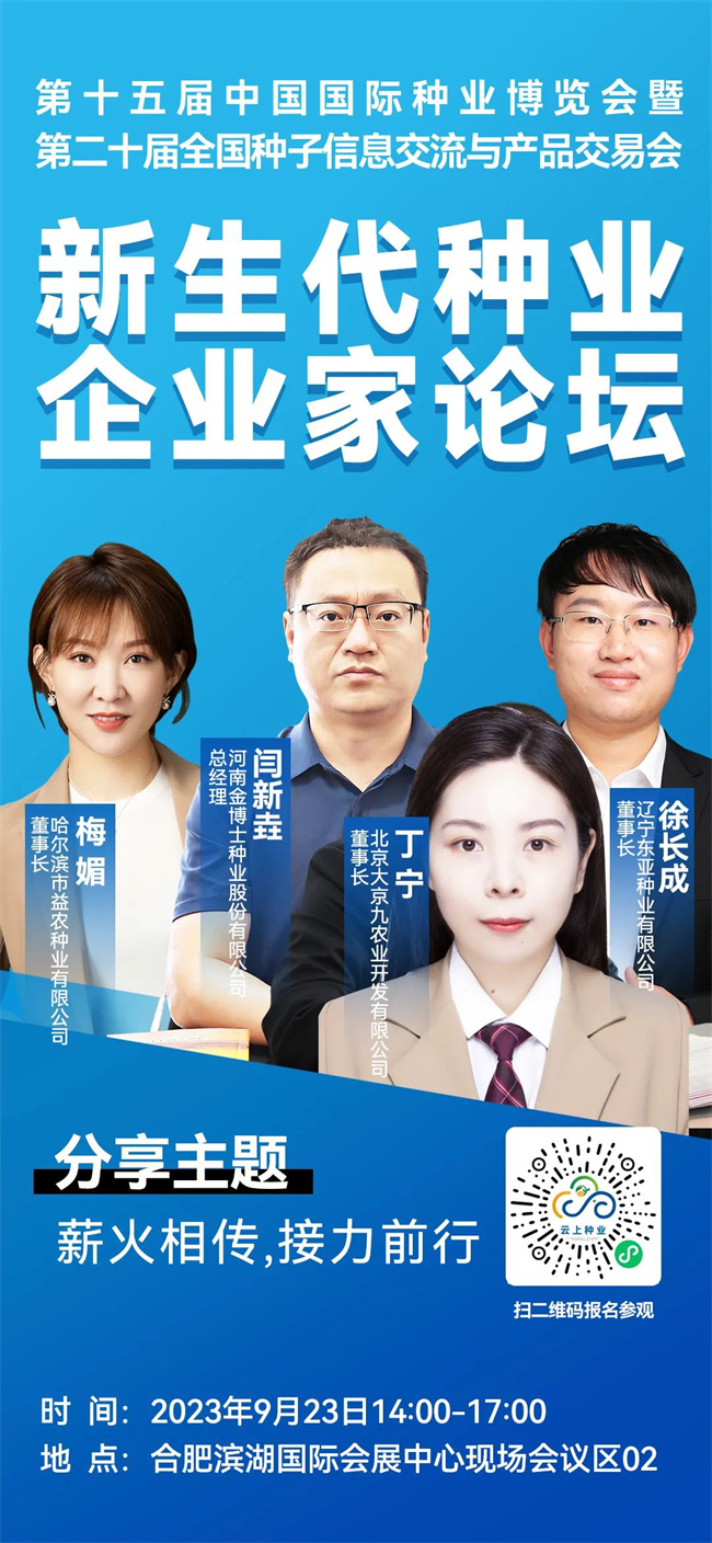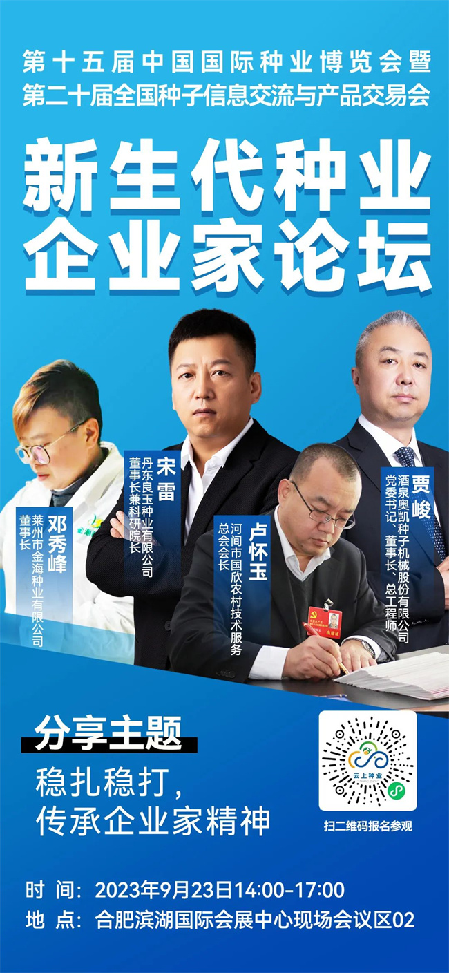 2023年9月23日,第十五屆中國國際種業博覽會暨第二十屆全國種子信息交流與產品交易會——新生代種業企業家論壇將邀請新生代種業企業家中的翹楚,分享他們的智慧。