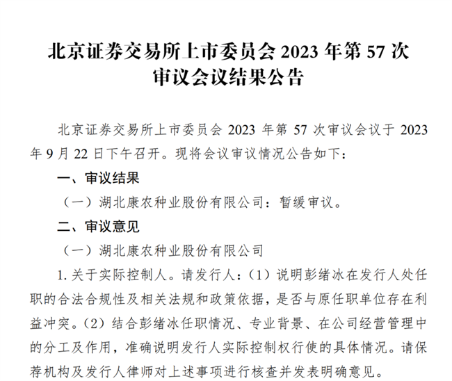 9月22日晚間,北京證券交易所上市委員會2023年第57次審議會議結果公告發布,公告顯示:審議結果為,湖北康農種業股份有限公司:暫緩審議。