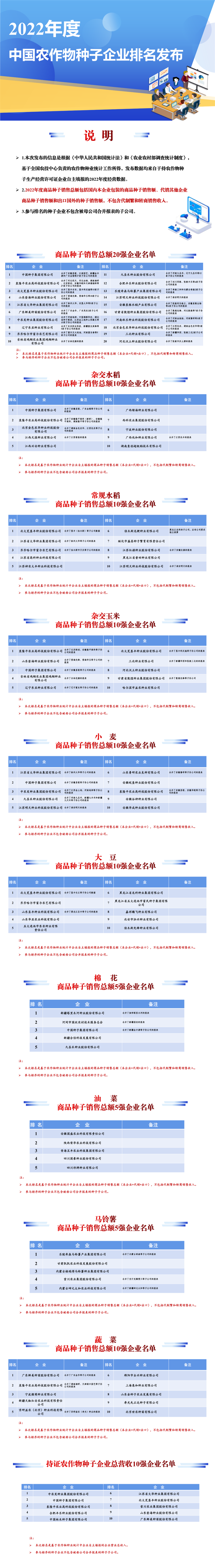 2022年度水稻、小麥、玉米、大豆、冬油菜、花生、馬鈴薯、結球甘藍等農作物推廣面積前十大品種名單,2022年度中國種業企業商品種子銷售總額前20強,水稻、雜交玉米、小麥、大豆、蔬菜企業商品種子銷售總額前10強,棉花、馬鈴薯、油菜企業商品種子銷售總額前5強等。