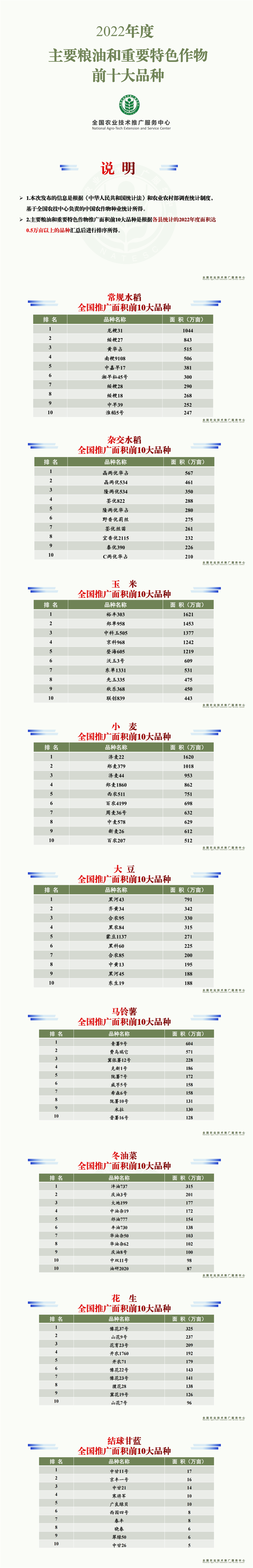 會上發布了2022年度水(shui)稻(dao)、小麥、玉(yu)米、大豆、冬油(you)菜、花生、馬鈴(ling)薯、結球甘藍推(tui)廣面(mian)積前十(shi)大品種名單