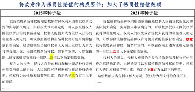 突破點四:健全侵權損害賠償制度。原《種子法》中規定,嚴重侵權行為賠償數額為確定數額的一倍以上三倍以下,新《種子法》中賠償數額擴大到確定數額的一倍以上五倍以下。