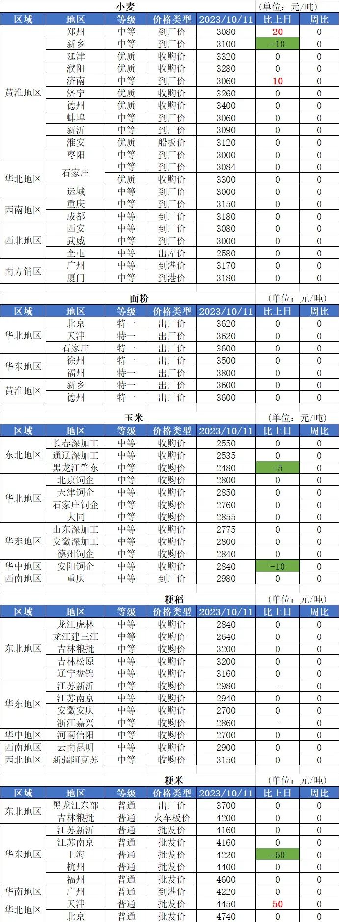 2、10月11日玉米價格局部下跌,其中:南北港口、南方銷區玉米價格小幅下跌,跌幅20-70元/噸;華北地區、東北地區玉米價格基本穩定,局部價格小幅下跌,跌幅10-40元/噸。