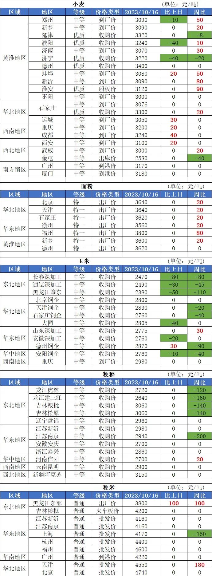 1、10月16日國內小麥震蕩上行,變化幅度5厘-1分。進入第四季度,制粉需求緩慢提升,貿易主體有序售糧,制粉企業根據庫存和原糧到貨情況調整價格,收購價格保持震蕩上漲態勢。