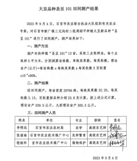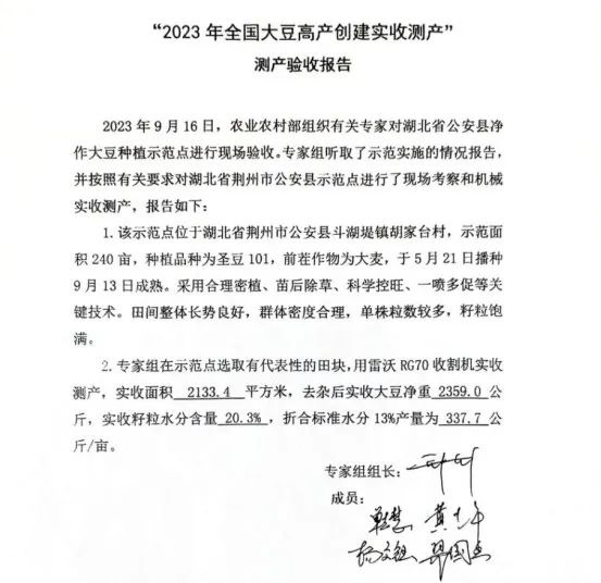2023年9月16日,由農業農村部組織,由南京農業大學邢邯教授、四川農業大學楊文玉教授、安徽省農科院黃志平研究員、中國農科院油料所單志慧研究員、湖北省農技推廣總站羿國香研究員組成聯合測產專家組,對位于湖北省公安縣斗湖堤鎮胡家臺村的240畝“圣豆101”進行現場實收實測,實收面積2133.4㎡,去除雜質實收凈大豆2395.0公斤,實收大豆籽粒水份含量20.3%,折合標準水份13%,標準畝畝產量為675.4斤。