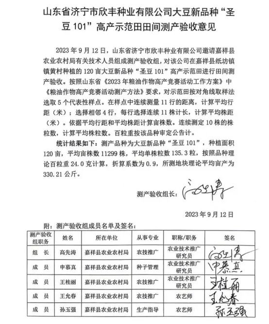 2023年9月12日,山東省嘉祥縣農業農村局農技推廣中心、生產科、種子站相關專家聯合對位于嘉祥縣紙坊鎮黃村的120畝“圣豆”101進行田間測產,折合標準畝畝產660.42斤。
