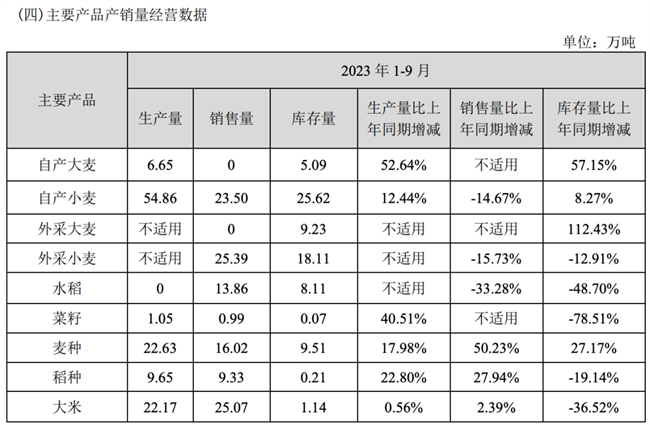 根據主要產品產銷量經營數據,種子方面,2023年1-9月,麥種銷(xiao)售量(liang)為(wei)16.02萬(wan)噸(dun),比(bi)上年同期增長50.23%,庫存量(liang)9.51萬(wan)噸(dun);稻種銷(xiao)售量(liang)9.33萬(wan)噸(dun),比(bi)上年同期增長27.94%,庫存量(liang)為(wei)0.21萬(wan)噸(dun)。