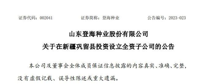 據悉,登海種業于2023年10月27日召開第八屆董事會第八次會議,審議通過了《關于在新疆鞏留縣投資設立全資子公司的議案》。根據相關法律法規及《公司章程》的規定,本次對外投資的投資額在公司董事會決策權限內,無需提交股東大會審議批準。董事會授權公司經營層具體辦理本次投資設立子公司的相關事宜,包括但不限于簽署協議、公司章程,辦理注冊登記等。