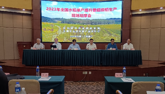 10月27日,受農業農村部科技教育司委托,全國農業技術推廣服務中心在廣西南寧召開全國水稻單產提升暨超級稻生產現場觀摩會。參會代表現場觀摩了廣西水稻產能提升行動超級稻高產高效技術賓陽示范基地和廣西鴻發米業有限公司。
