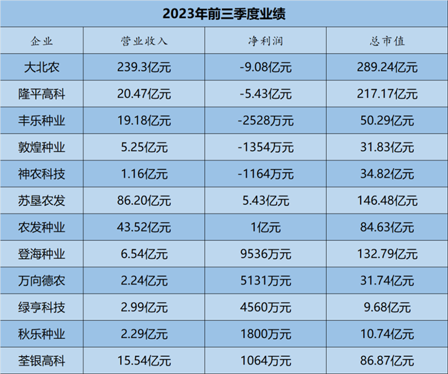 近日,各大上市種業企業2023年前三季度業績報告已全部出爐,各有盈虧。其中,隆平高科前三季凈虧損5.43億元,同比減虧超20%,收購隆平發展落地。豐樂種業、敦煌種業、神農科技發生虧損。