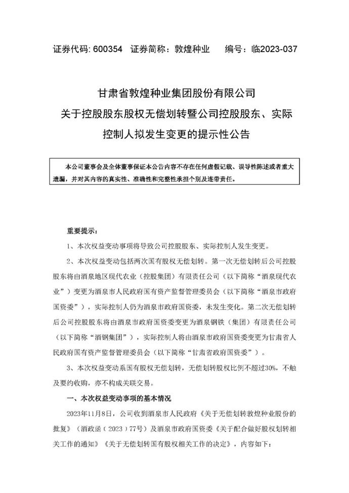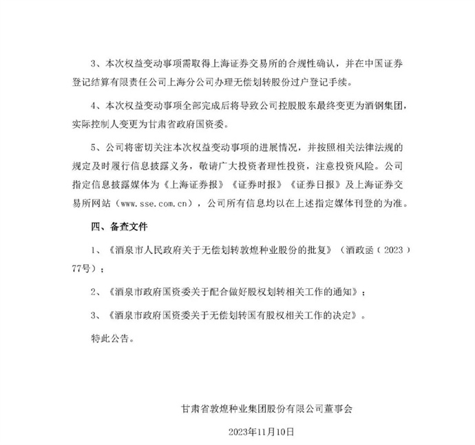 敦煌種業11月9日公告,11月8日,公司收到酒泉市人民政府《關于無償劃轉敦煌種業股份的批復》及酒泉市政府國資委《關于配合做好股權劃轉相關工作的通知》《關于無償劃轉國有股權相關工作的決定》。