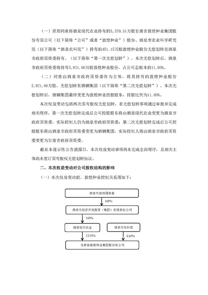 本次權益變動包括兩次國有股權無償劃轉,若無償劃轉事項通過審批并完成相關程序,第一次無償劃轉完成后公司控股股東將由酒泉現代農業變更為酒泉市政府國資委,實際控制人仍為酒泉市政府國資委;第二次無償劃轉完成后公司控股股東將由酒泉市政府國資委變更為酒鋼集團,實際控制人將由酒泉市政府國資委變更為甘肅省政府國資委。