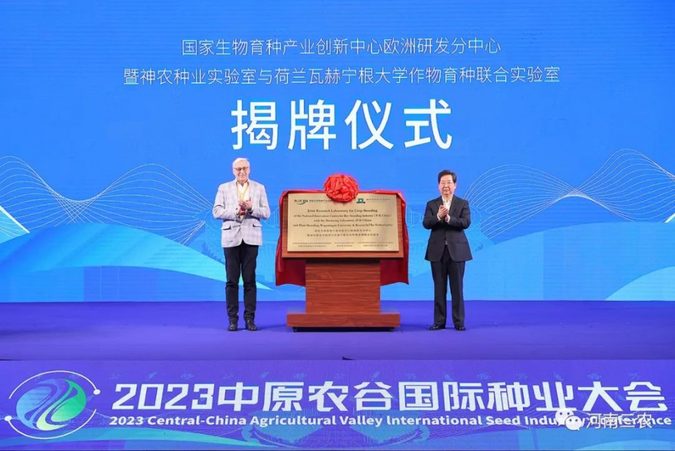 樓陽生宣布大會開幕,與荷蘭皇家科學與人文學會院士、歐洲植物育種協會前主席理查德·威薩共同為“國家生物育種產業創新中心歐洲研發分中心暨神農種業實驗室與荷蘭瓦赫寧根大學作物育種聯合實驗室”揭牌。