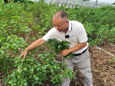 在國家野生棉種質資源圃的溫室中,中國農科院棉花研究所海南科研中心負責人劉記正在觀察野生棉的生長情況。陳楠 攝