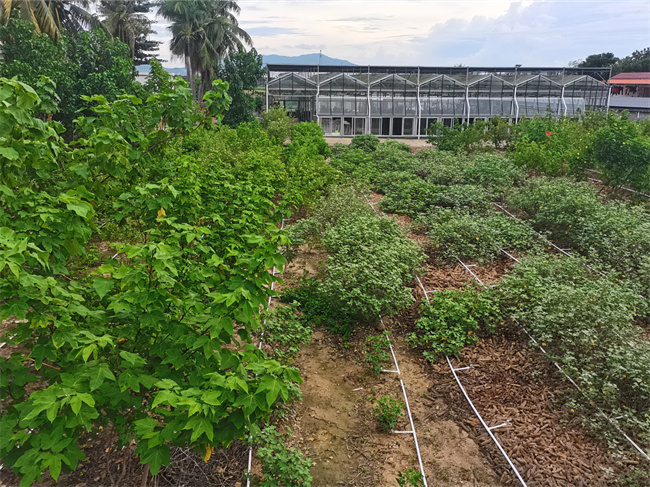 走進資源圃,就仿佛走進了具有熱帶風情的“小花園”,這里的野生棉與日常生活中我們看到的棉花不同,姿態各異。有的與路邊的高大樹木無異、有的茂盛如灌叢,還有的匍匐在地,錯落有致,每一種都有獨特的編號。