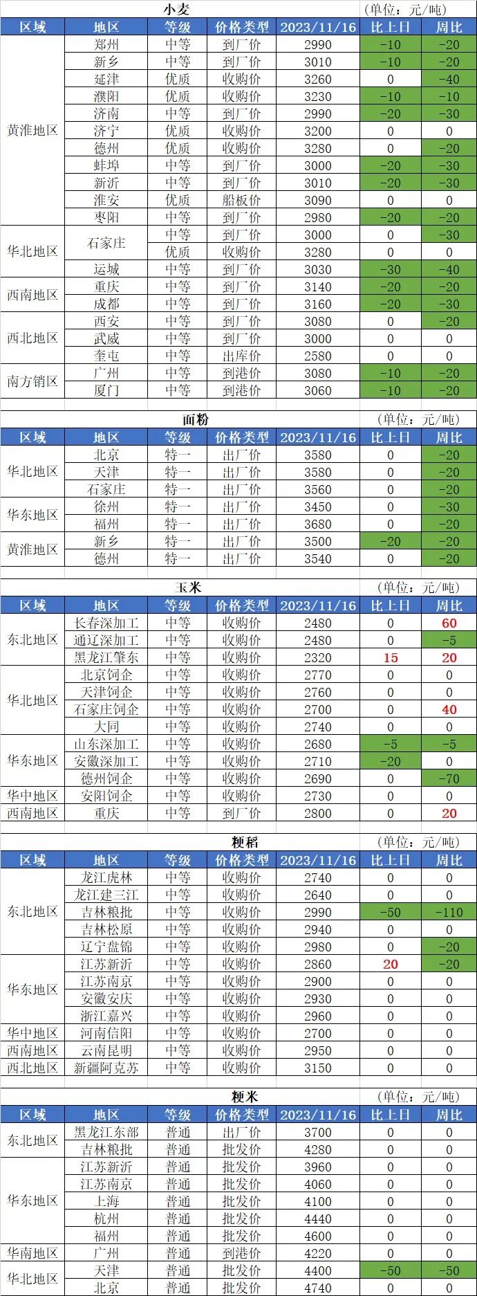 2、11月16日國內玉米價格小幅調整,其中:南北港口、南方銷區玉米價格基本穩定;華北地區玉米價格基本穩定,局部價格小幅下跌,跌幅10元/噸;東北地區玉米價格基本穩定,局部價格小幅漲跌,漲幅10元/噸。