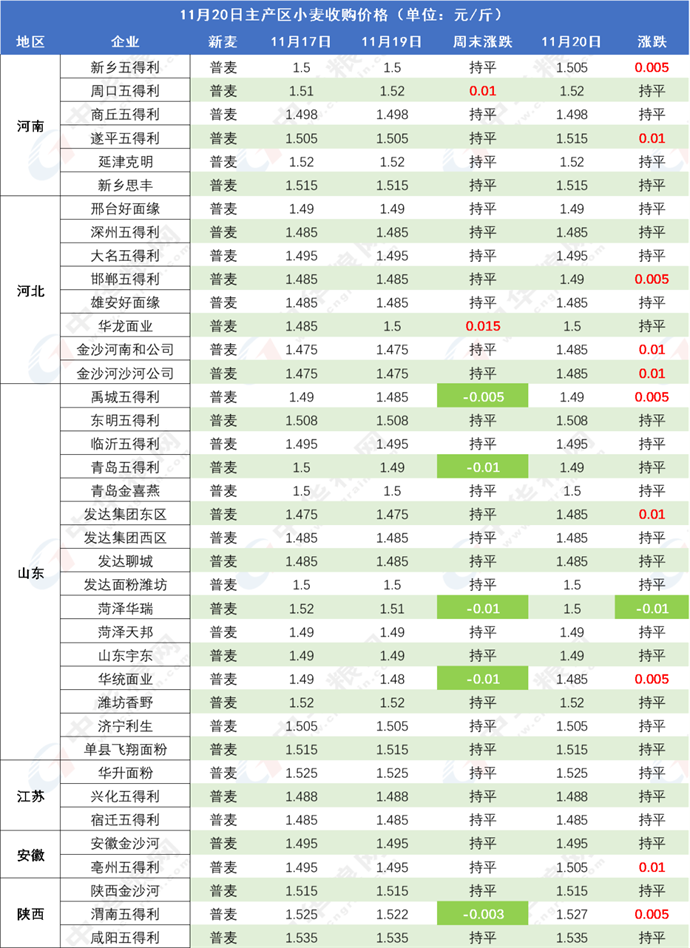 圖1:11月20日主產區小麥收購價格