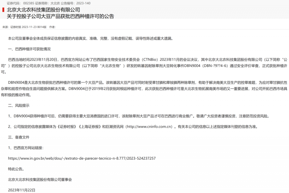 日前,大北農發布公告稱,公司控股子公司北京大北農生物技術有限公司研發的轉基因耐除草劑大豆轉化事件DBN9004(DBN-94-6)通過巴西國家生物安全技術委員會安全評價審查,正式獲批種植許可。