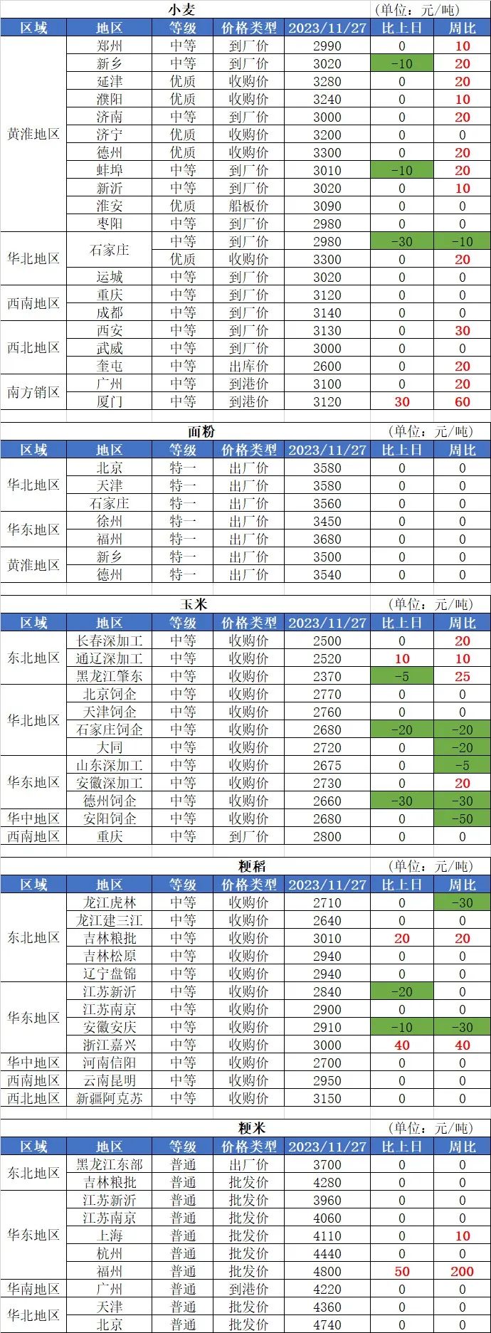 2、11月27日國內玉米價格局部下跌,其中:南北港口、東北地區、南方銷區玉米價基本穩定;華北地區玉米價格基本穩定,局部價格小幅下跌,跌幅20-40元/噸。
