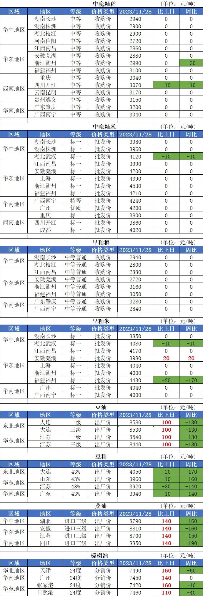 3、截至11月24日,湖北省入統企業累計收購中晚秈稻166.12億斤,較去年同期減少10.1%。其中,新季中晚秈稻累計收購103.61億斤,較去年同期減少2.1%。