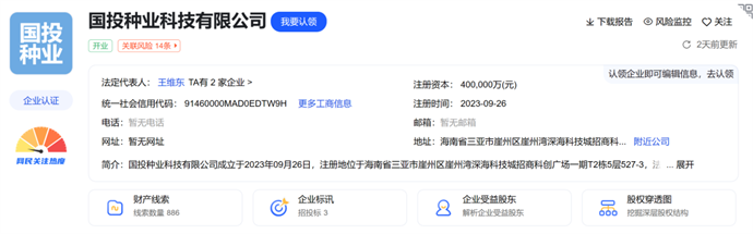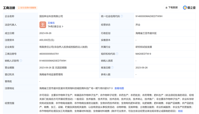 國投種業科技有限公司(簡稱“國投種業”)在崖州灣科技城完成注冊,法定代表人王維東,注冊資本40億元,經營范圍包括主要農作物種子生產、轉基因農作物種子生產、農作物種子經營等。公開信息顯示,國投種業為國投集團全資子公司,是國投集團生物育種產業投資運營管理平臺。