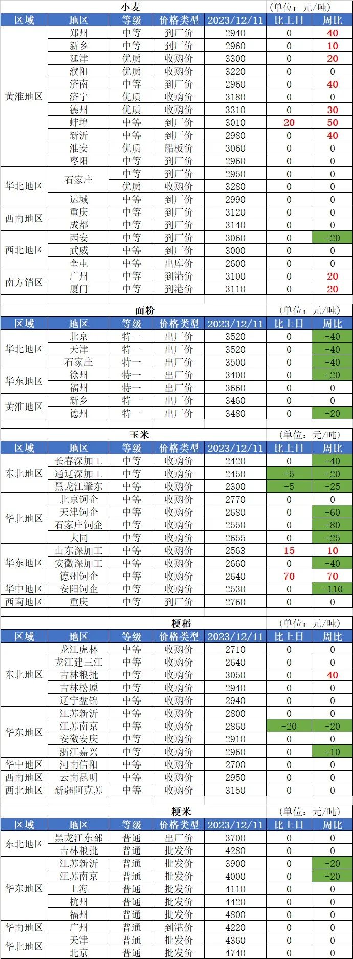 2、12月11日國內玉米價格小幅調整,其中:南北港口玉米價基本穩定;華北地區、東北地區玉米價格基本穩定,局部價格小漲,漲幅10-20元/噸;南方銷區玉米價格下跌,跌幅20元/噸。