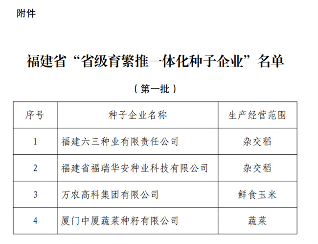 福建六三種業有限責任公司、福建省福瑞華安種業科技有限公司、萬農高科集團有限公司、廈門中廈蔬菜種籽有限公司這4家企業獲認定。