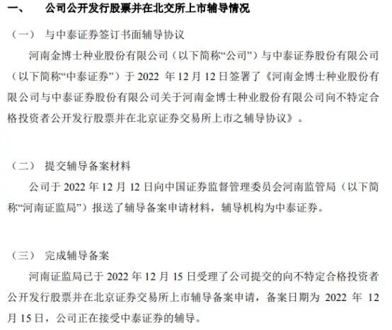 日前,據證監會網站,河南金博士種業股份有限公司的上市輔導(dao)(dao)狀態更新為“輔導(dao)(dao)驗收”。