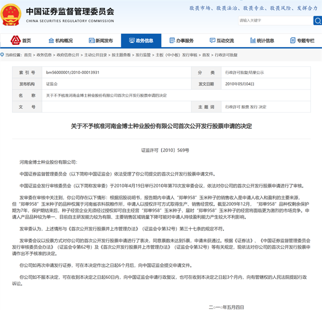 早在2010年(nian),河南金博士種業(ye)便(bian)謀(mou)劃過上市事宜,但中(zhong)國證券監督管理(li)委員會最(zui)終(zhong)作出了(le)不予核(he)準的決定(ding)。
