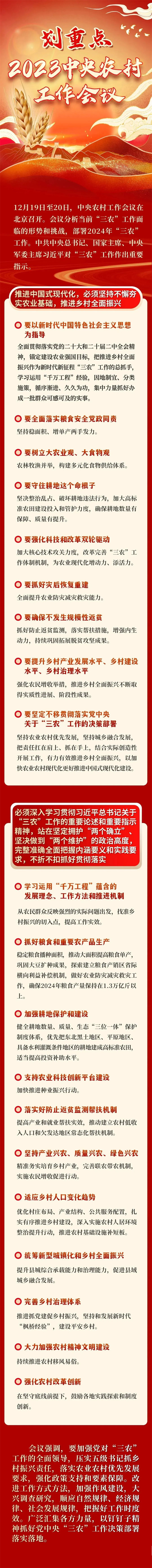 12月20日,全(quan)國農業(ye)農村(cun)(cun)廳局長會(hui)(hui)(hui)議在北京召開,農業(ye)農村(cun)(cun)部黨(dang)組書記、部長唐仁健出(chu)席(xi)會(hui)(hui)(hui)議并講話。會(hui)(hui)(hui)議強調,要(yao)堅(jian)持以(yi)習近(jin)平新時代中國特色社會(hui)(hui)(hui)主(zhu)義思想為指導,全(quan)面(mian)貫徹落實黨(dang)的(de)二十(shi)大(da)和二十(shi)屆二中全(quan)會(hui)(hui)(hui)精神,深入學習貫徹習近(jin)平總書記關于三農工(gong)(gong)作(zuo)的(de)重(zhong)要(yao)論述,認(ren)真落實中央(yang)經濟(ji)工(gong)(gong)作(zuo)會(hui)(hui)(hui)議、中央(yang)農村(cun)(cun)工(gong)(gong)作(zuo)會(hui)(hui)(hui)議部署要(yao)求,錨定建設農業(ye)強國目標,以(yi)學習運用“千萬工(gong)(gong)程”經驗為引領(ling),著力(li)夯(hang)基礎、穩產能、防風險、增活力(li),堅(jian)決守住三農底線,扎實推進鄉村(cun)(cun)產業(ye)發展、鄉村(cun)(cun)建設、鄉村(cun)(cun)治理重(zhong)點(dian)任務,努力(li)推動三農工(gong)(gong)作(zuo)持續(xu)取(qu)得(de)新進展新提(ti)升。