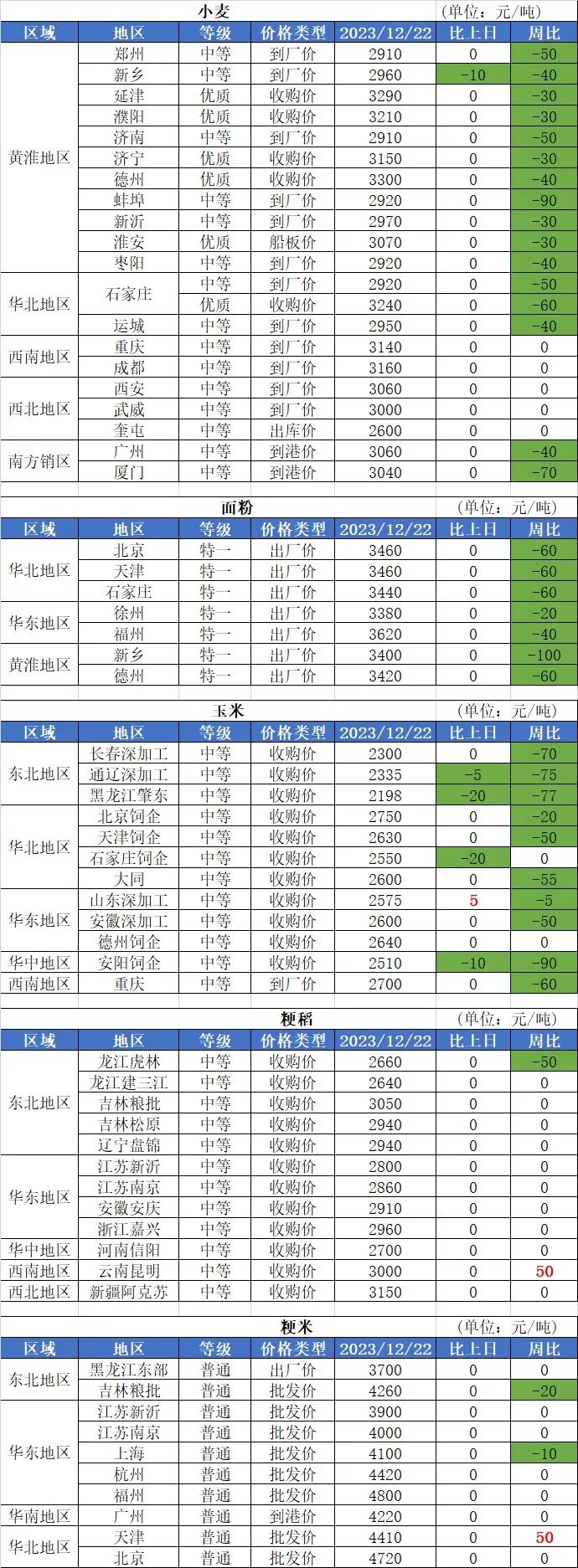 1、12月22日國內小麥收購價格繼續下跌,下跌速度有所放緩,跌幅0.5-1.5分/斤,主流收購價格在1.4-1.483元/斤,收購均價1.453元/斤,較上周同期下跌0.36分/斤。