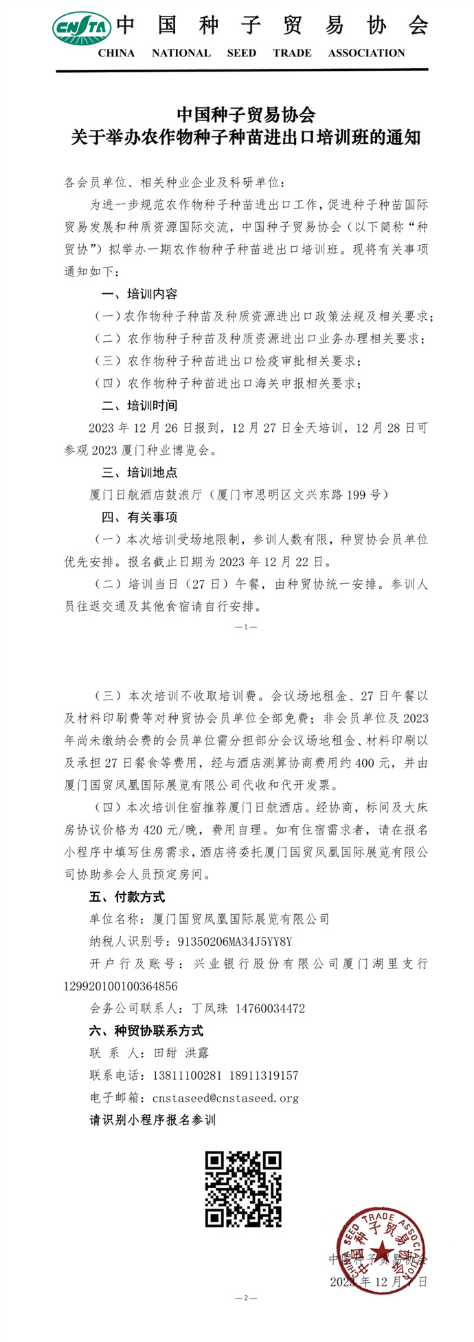 此外,為了進一步規范和幫助企業順利開展種子進出口業務,中國種子貿易協會將于12月27日在福建廈門組織相關培訓班,歡迎報名參會。