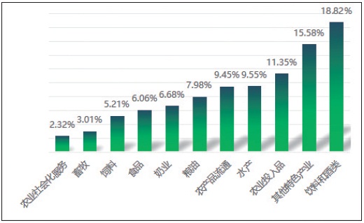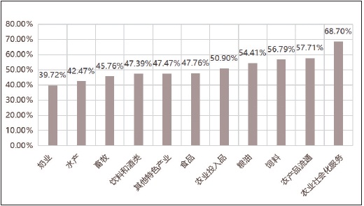 500強的企業呈現多元化分布的格局,食品加工行業的企業數量相對較多。從細分行業來看,食品類、農產品流通類和畜牧養殖類的500強企業數量占比分別為24.60%、15.30%和14.80%;糧油生產類企業占13.60%,飼料生產類企業占8.90%。從各行業的成本費用利潤率和資產負債率來看,飲料和酒類、其他特色產業和農業投入品行業的成本費用利潤率相對較高,分別為18.82%、15.58%和11.35%,全部500強企業的平均成本費用利潤率為7.81%。農業社會化服務類、農產品流通類、飼料生產類行業的資產負債率相對較高,分別為68.70%、57.71%和56.79%,全部500強企業的平均資產負債率為46.36%。