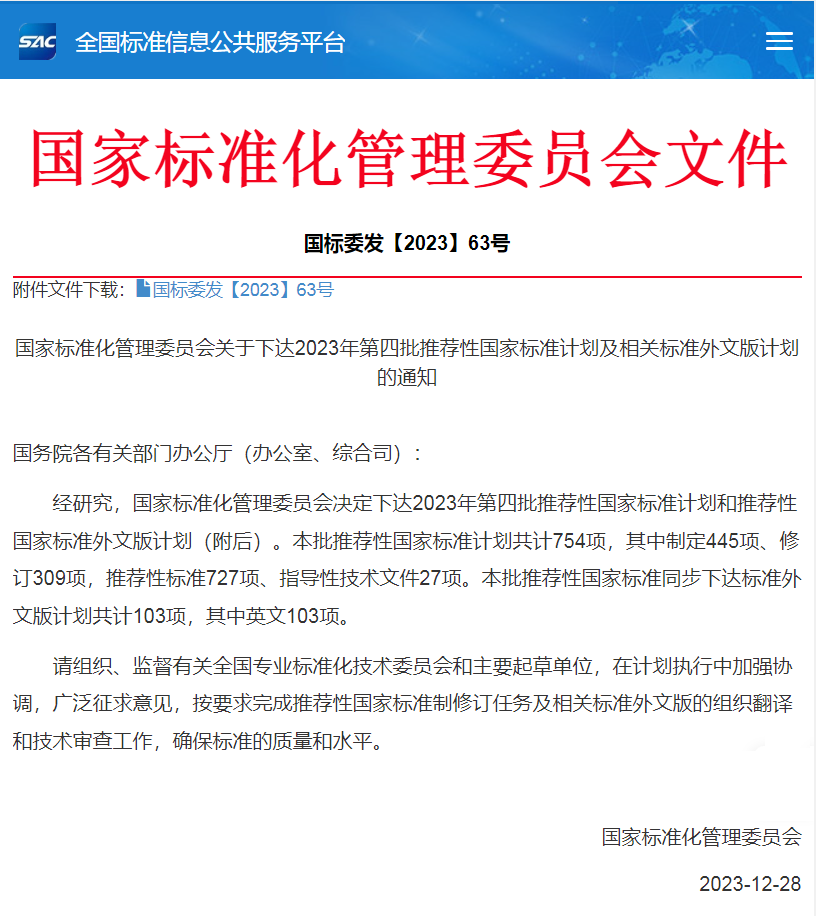 近日,國家標準化管理委員會發布關于下達2023年第四批推薦性國家標準計劃及相關標準外文版計劃的通知(國標委發〔2023〕63號),下達推薦性國家標準計劃754項,下達標準外文版計劃共計103項,其中英文103項。